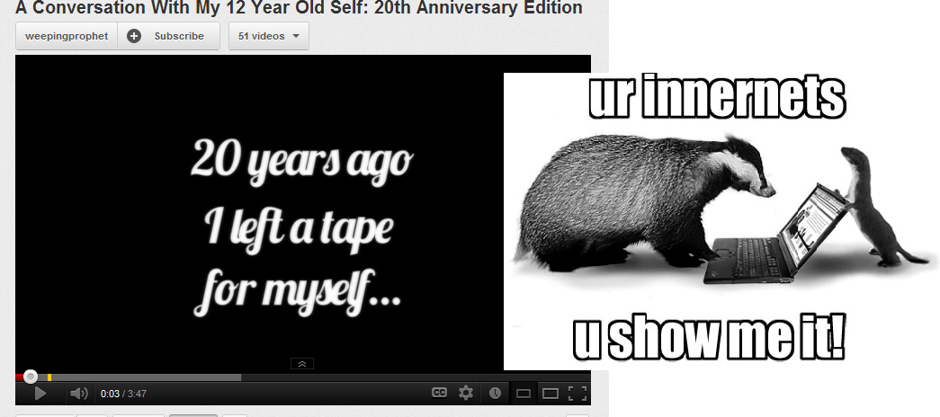 This video is what we call genius and made us wonder how conversations with our 12 year old selves would go. I know mine would definitely be disappointed that I do not live in Mauritius or Switzerland  that is for certain, I seriously had an obsession with the Swiss Alps when I was younger and I was going to have my cabin there with my sledge dogs named Oliver and Pluto – DO.NOT.LAUGH! Anything your 12 year old self would not be pleased about?