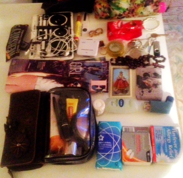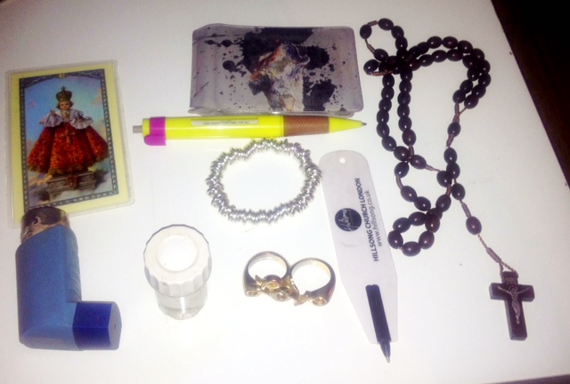 Front row– L-R 1 – Inhaler/ Asthma pump(I need this on me all the time, especially this winter season and well whenever I lose my temper which thankfully hardly ever happens), 2 – Contact Lenses – Without my contact lenses I am as blind as a bat – NO LIE! And as I’m constantly facing a computer screen sometimes they dry up – I think contact lenses are the neediest things ‘Oh look at me I’m dry, ooh I can’t cope, take me out !’, 3. LOVE ring – I carry love with me in my heart and literally in my bag – carry it, exude it and receive it! 4. Pen – courtesy of my second church ‘Hillsong’, 5. Rosary – well I’ve always carried one for as long as I can remember!