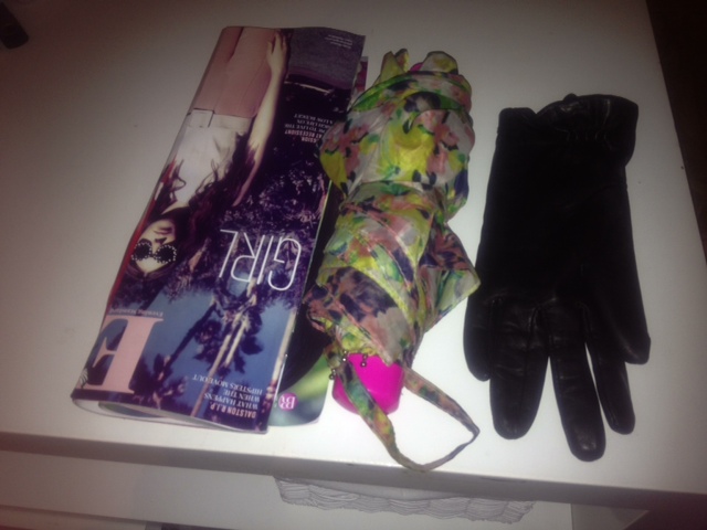 L-R 1. ES Magazine (Depending on the day really that could be either The Stylist Magazine or Shortlist Magazine which are free magazines they offer us London commuters..well for £43 I’m also expecting a Starbucks latte with these magazines!), 2. Umbrella (Can’t be in London and not have this with you ALL the time) 3. Glove – yes just one glove!I’m not sure how I lost the other one but I desperately need them as it is freezing right now)