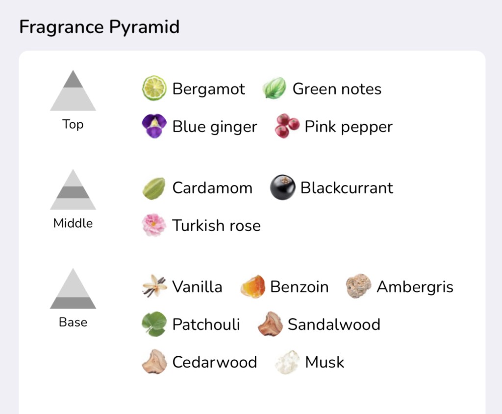 • Top Notes: Bergamot, Green Notes, Blue Ginger, Pink Pepper