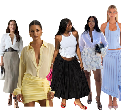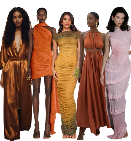 Summer’s golden girl colour palette is more than metallic, its warm and sensual. Butter yellow slip dresses, bronze satin pieces, and marigold camisoles that shimmer in motion. Shades like pale gold, tawny rose, and burnt sienna reflect the fleeting softness of late summer – the kind of warmth that lingers on skin and memory.