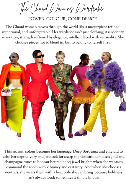 Fashion, Home The Chaud Woman’s Wardrobe The visualisation of the Ultimate Chaud Woman’s wardrobe – is power, colour and confidence. Discover more from Chaud: The Magazine Subscribe to get the latest posts sent to your email. Type your email… Subscribe Share this: Click to share on X (Opens in new window) X Click to share on Pinterest (Opens in new window) Pinterest Like Loading... Related